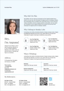เทมเพลต เรซูเม่ สไตล์ One-Page ไฟล์ Word รูปแบบนี มีการจัดการพื้นที่ ในเรซูเม่ ได้อย่างดี พร้อมการเพิ่มลูกเล่น QR Code มาเป็นช่องทางการติดต่อด้วย รวมไปถึง ยังมีส่วน ที่ให้แสดงผลงานที่ผ่านมาอีกด้วย ดาวน์โหลดได้ฟรีที่นี่